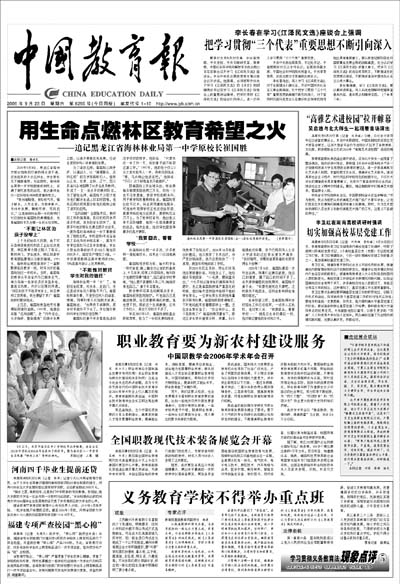 传播教育改革与发展的信息和经验。除要闻版外,还辟有高等教育、基础教育、职成教育、理论、国际教育等专刊,校长、读书、招生考试与就业等周刊。每周一、二、三、四、五对开八版。