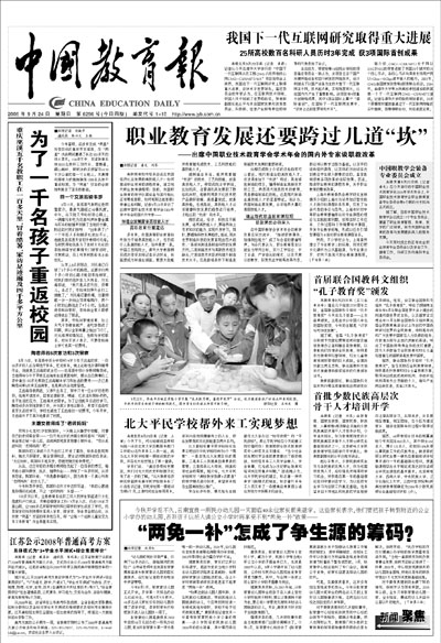 传播教育改革与发展的信息和经验。除要闻版外,还辟有高等教育、基础教育、职成教育、理论、国际教育等专刊,校长、读书、招生考试与就业等周刊。每周一、二、三、四、五对开八版。