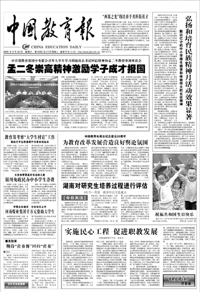 《中国教育报》是教育部主办的以教育新闻为主的全国性日报。它的宗旨是全面、准确、及时地宣传党和国家的教育方针、政策及工作部署,