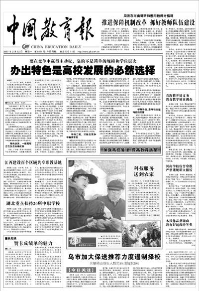 传播教育改革与发展的信息和经验。除要闻版外,还辟有高等教育、基础教育、职成教育、理论、国际教育等专刊,校长、读书、招生考试与就业等周刊。每周一、二、三、四、五对开八版。