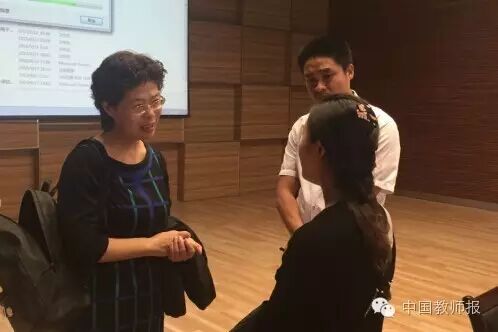 如饥似渴听讲 渴盼深度交流—— 分享教育智慧 点燃教育激情在送教行活动的每一站,老区的校长教师们除了如饥似渴地听专家的讲课外,还不放过一切与专家交流的机会。在瑞金送教时,中国人民大学附属小学校长郑瑞芳遇到了许多粉丝,有一位小学校长向郑瑞芳请教各种问题,寸步不离问了半个多小时。