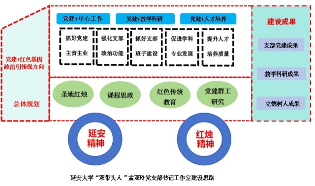 同时,该党支部基于延安精神,创新实施了“12345”党建工作模式:“1个方向”——以“党建+红色基因”政治引领为方向;“2种精神”——延安精神和红烛精神;“3个融合”——党建与中心工作相融合、党建与教学科研相融合、党建与人才培养相融合;“4种途径”——创建“圣地红烛”党建品牌、抓好课程思政教学、做好红色传统教育、加强党建群工课题研究;“5个内容”——抓好党建主责主业、强化支部政治功能、抓好支部班子建设、促进学科专业发展、提升人才培养质量。创建“双带头人孟亚玲工作室”微信公众号,设置支部概况、学思践悟、立德树人三大板块及十五个二级菜单,使其成为理论学习、党建成果展示的窗口和党建与学术交流的重要平台,推动三会一课、组织建设、教学科研、学生教育、学术前沿深度融合。