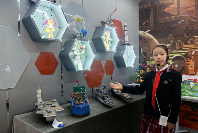 学生向与会来宾介绍“太空梦想家”科技展馆中的作品