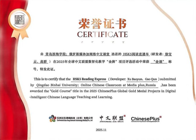 11月14日-16日,由中国教育部主办,教育部中外语言交流合作中心、中国国际中文教育基金会、世界汉语教学学会共同承办的2025世界中文大会在北京举行。来自全球160多个国家和地区的教育主管部门、中外高校负责人、驻华使节等近2000人参会。由青岛滨海学院与俄罗斯媒体加网络中文课堂共同培育的《HSK5阅读直通车》课程,在2025全球中文联盟数智化教学“金牌”项目评选活动中荣获“金课”奖项。