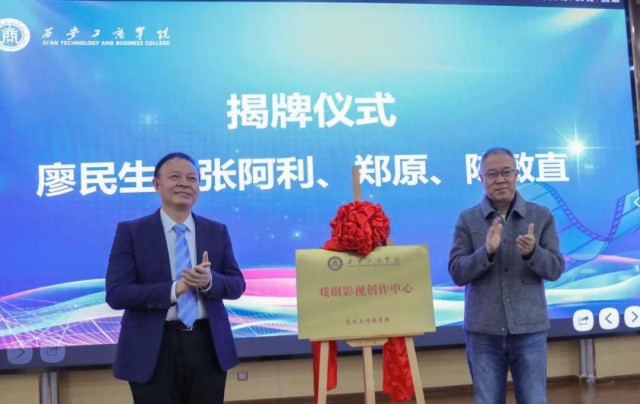 西安工商学院校长廖民生与陕西卫视总编郑原为“戏剧影视创作中心”揭牌