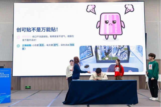 在科普宣讲比赛环节,嘉兴大学团队将文化创意与科学传播相结合,在荣获一等奖的情景剧作品《头孢配酒》中借鉴经典影视叙事风格,通过生动的情节和人物形象,将严谨的用药安全知识融入故事。