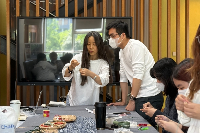 留学生们亲手制作象征吉祥的“财神吊坠“绳编