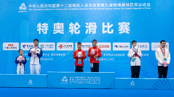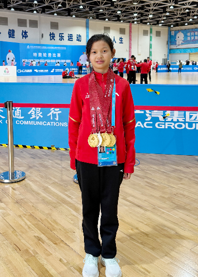 赛场上,特奥健儿们化身追风少年,在轮滑赛道上风驰电掣、绽放光芒。13岁小将易静玉展现出超越年龄的实力与沉稳,在女子组比赛中强势突围,一举包揽300米、500米、1000米决赛三枚金牌,完美实现个人项目大满贯,尽显赛场锋芒。