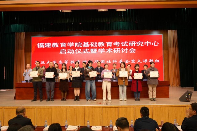 启动仪式上,复旦大学高等教育研究所授予考试研究中心“国家社科基金教育学重大项目‘拔尖创新人才贯通式培养研究’协作研究单位”牌匾。福建教育学院党委委员、副院长张志刚嘉宾,为学术顾问、基地校及研究员授牌并颁发证书。