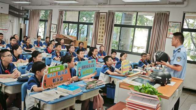 规则入心,平安出行。9月,学校特邀临平交警大队塘栖中队警官孙扬来校,举行“交通安全伴我行”国旗下讲话。孙扬结合13年从警经历,围绕“规则、警惕、榜样”三个关键词,用真实的交通事故案例,深入浅出地讲解了遵守信号灯、规范佩戴头盔、警惕车辆盲区、拒绝做“低头族”等交通安全知识,并倡议学生争做家庭交通安全监督员。孙扬还进班为学生们示范头盔的正确佩戴方法,手把手指导如何调节卡扣、确保贴合。本次活动使学生交通安全意识普遍增强,校园周边学生骑行电动车头盔佩戴率显著提升,学生过马路更加注重观察、走斑马线。学校与交警中队建立常态化联络机制,为保障学生上下学路途安全提供有力支撑。