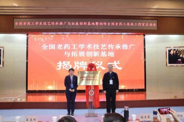 贾明远与药学院负责人为“全国老药工学术技艺传承推广与拓展创新基地”揭牌