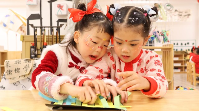 幼儿聚精会神地做着非遗手工