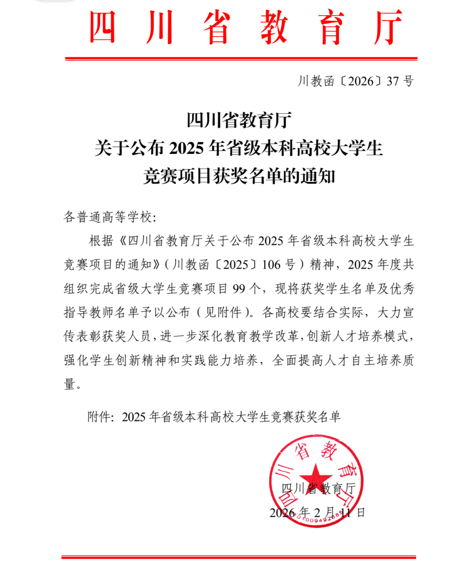 四川省教育厅发布《关于公布2025年省级本科高校大学生竞赛项目获奖名单的通知》(川教函〔2026〕37号)