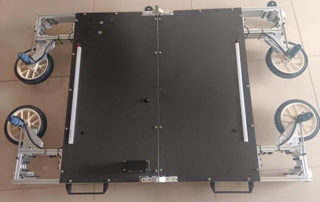 正当团队一筹莫展时,一篇关于仿生学的文献带来转机——“蜘蛛蟹”八条腿倾斜安装、末端细窄的结构特征,启发团队将车轮改为倾斜38°安装。团队先用木板搭建基础模型验证可行性,再利用3D打印技术制作从动轮安装架,最终以高强度铝合金完成整车制作。从动轮由4个增至8个,横向主动轮与旋转式机械臂提供精准动力,混控拖刹车实现遥控中位自动制动。