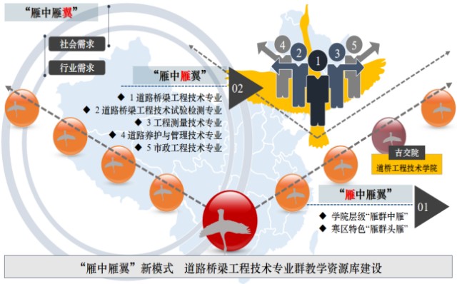 所谓“雁群”,是指学院联合多所兄弟院校组成的专业群建设联盟,各成员单位分批次建设和升级自身优势资源,实现优质资源的共建共享;而“雁中雁”则是学院内部的阶梯发展模式,以底蕴深厚的道桥专业为领军,带动汽车专业和智能交通专业的协同发展。