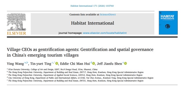 近日,西安欧亚学院艾德艺术学院副教授王瑛及其研究团队在SSCI一区顶级期刊《Habitat International》上发表题为“Village CEOs as gentrification agents: Gentrification and spatial governance in China's emerging tourism villages(村庄CEO作为绅士化推手:中国新兴旅游村的绅士化与空间治理)”的研究论文。