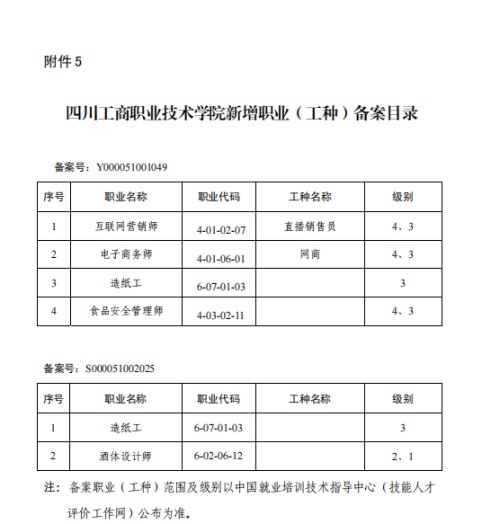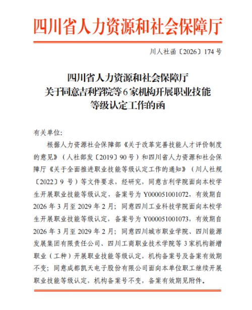 近日,四川省人力资源和社会保障厅印发《关于同意吉利学院等6家机构开展职业技能等级认定工作的函》(川人社函〔2026〕174号),同意四川工商职业技术学院新增5个职业(工种)开展职业技能等级认定。