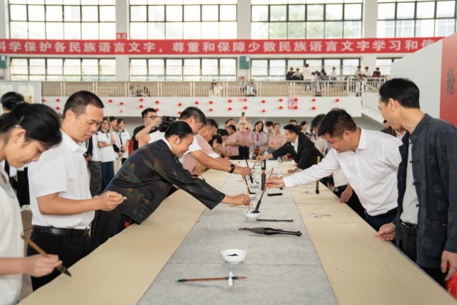 在现场挥毫环节,书法专家与学校师生代表共同登台。书法专家们笔走龙蛇、行云流水,一幅幅笔力遒劲、气韵生动的书法作品跃然纸上。师生代表也纷纷展示了自己的书法功底,一笔一画间透露出对书法艺术的热爱。