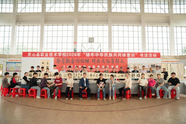 为深入学习贯彻习近平文化思想,全面落实立德树人根本任务,积极响应国家关于深入推进中华优秀语言文化传承发展及全面推进健康学校建设的部署要求,3月23日上午广西灵山县职业技术学校举办“翰墨飘香润校园 传承经典育新人”书法展进校园活动。本次活动以书法艺术为载体,深化美育浸润行动,旨在推动中华优秀传统文化在校园落地生根。
