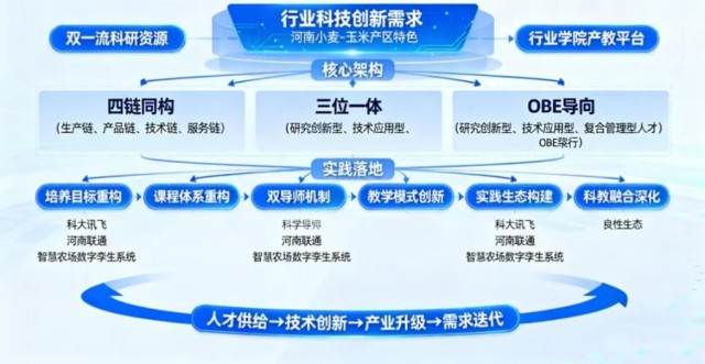 河南农业大学紧扣农业强国战略部署和河南农业现代化发展需求,紧密对接河南省农业强省建设、智慧农业高质量发展和乡村人才振兴实际需求,立足“服务河南现代农业发展、培养拔尖农林人才、引领区域农业科技创新”的办学定位,牵头联合河南恒茂创远科技股份有限公司等多家行业骨干企业与合作单位,依托河南省智慧农业特色行业学院建设平台,系统构建“OBE导向、三位一体、四链同构”的交叉复合型人才培养体系,以学科融合为核心,以产教协同为路径,构建起服务区域发展的“人才供给—技术创新—产业升级”的良性循环。