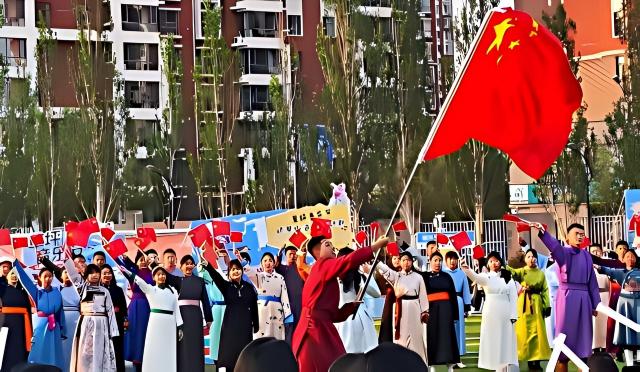 而鄂尔多斯市实验中学合唱团学生带来的《红旗飘飘》,则将气氛推向高潮。当铿锵有力的旋律响起,舞台上飘扬的五星红旗与台下各族学生手中的小国旗交相辉映。蒙古族学生用饱含深情的歌声,唱出对祖国的赤诚热爱,传递着“中华民族一家亲”的坚定信念。