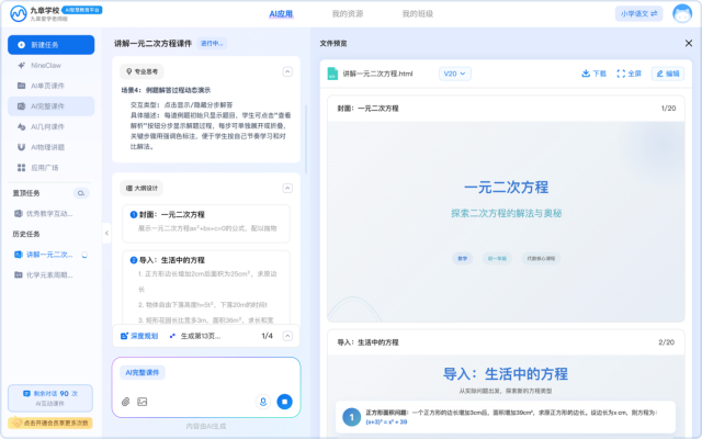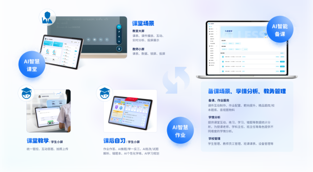 这得益于“九章爱学”的“1个平台+3块屏”架构。在这个体系中汇聚了AI智能备课、AI智慧课堂、AI智慧作业三大核心服务,“1个平台+3块屏”则覆盖课前备课、课中授课、课后学练全场景。AI深度赋能下的多屏联动,正助力传统课堂向高效课堂、精准课堂,进而向新质课堂转型进阶。