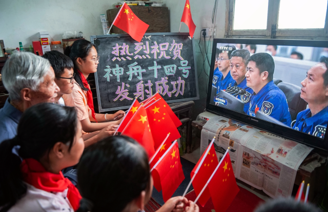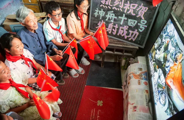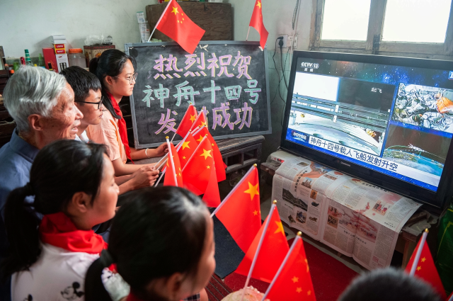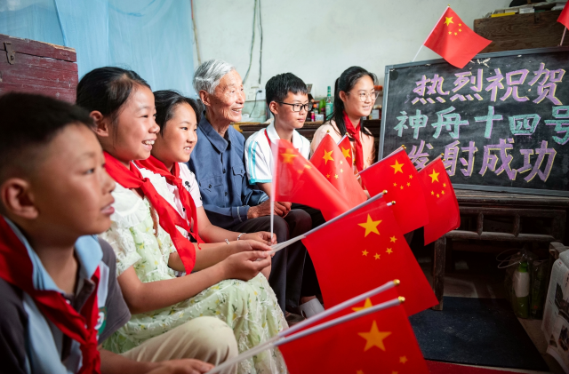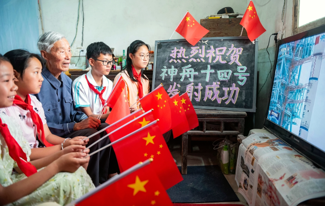 6月5日,在安徽省含山县仙踪镇大欧村留守儿童之家,退休教师欧澄裁组织留守儿童准时收看神舟十四号载人飞船发射升空的直播,通过直播让留守儿童了解航空航天知识,增强民族自信,接受爱国主义教育精神洗礼。欧宗涛 摄