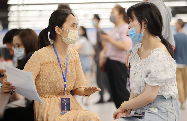 7月17日,浙江省湖州市德清县举行“百校千企万岗”招聘会,来自县内218家用人单位提供就业岗位3800余个,吸引众多求职者前来咨询应聘,为高校应届毕业生拓展就业领域。今年以来,德清县举行多场大学生就业创业招聘会,通过线上线下渠道为用人单位和求职者提供多种选择,推动高校毕业生多渠道多形式就业。谢尚国 摄
