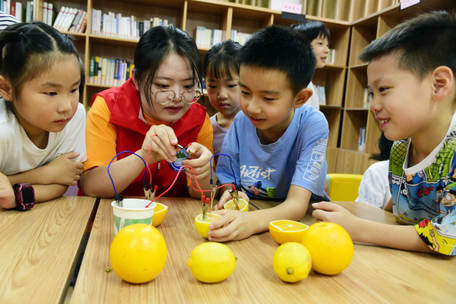 7月27日,江苏大学志愿者走进镇江市南山街道檀山白龙湖社区暑期托管小课堂,带着小朋友开展“乐学科普”活动,指导他们操作体验“水果电池”“史莱姆”“气泡”等化学科普小实验,学习科普知识,充实暑假生活。石玉成 摄