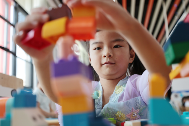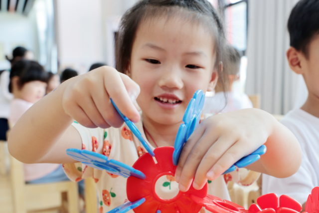 安徽当涂县春天学府幼儿园的孩子搭机器人积木