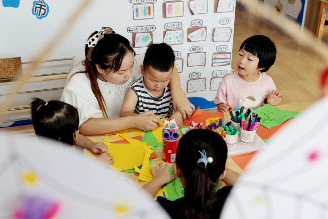 安徽当涂县春天学府幼儿园的孩子们在老师指导下做手工