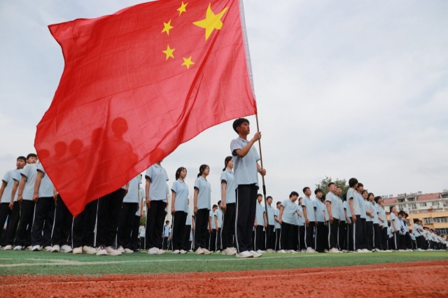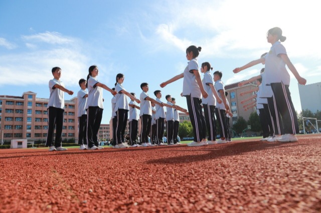 近日,山东省高密市第五中学组织800多名高一新生开展为期7天的军事训练,学生们通过队列动作、行进与立定、军体拳等军事课目训练,锻炼身体素质,磨炼意志品质,增强国防观念和爱国情怀。(中国教育报-中国教育新闻网 通讯员 李海涛 摄)