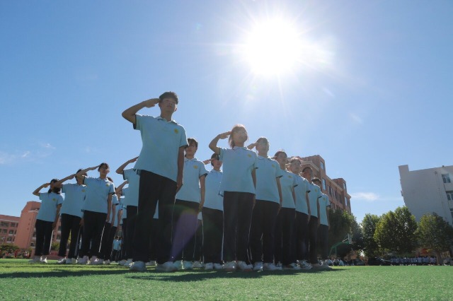 9月3日,在山东省高密市第五中学,高一新生正在参加军事课目训练。李海涛 摄