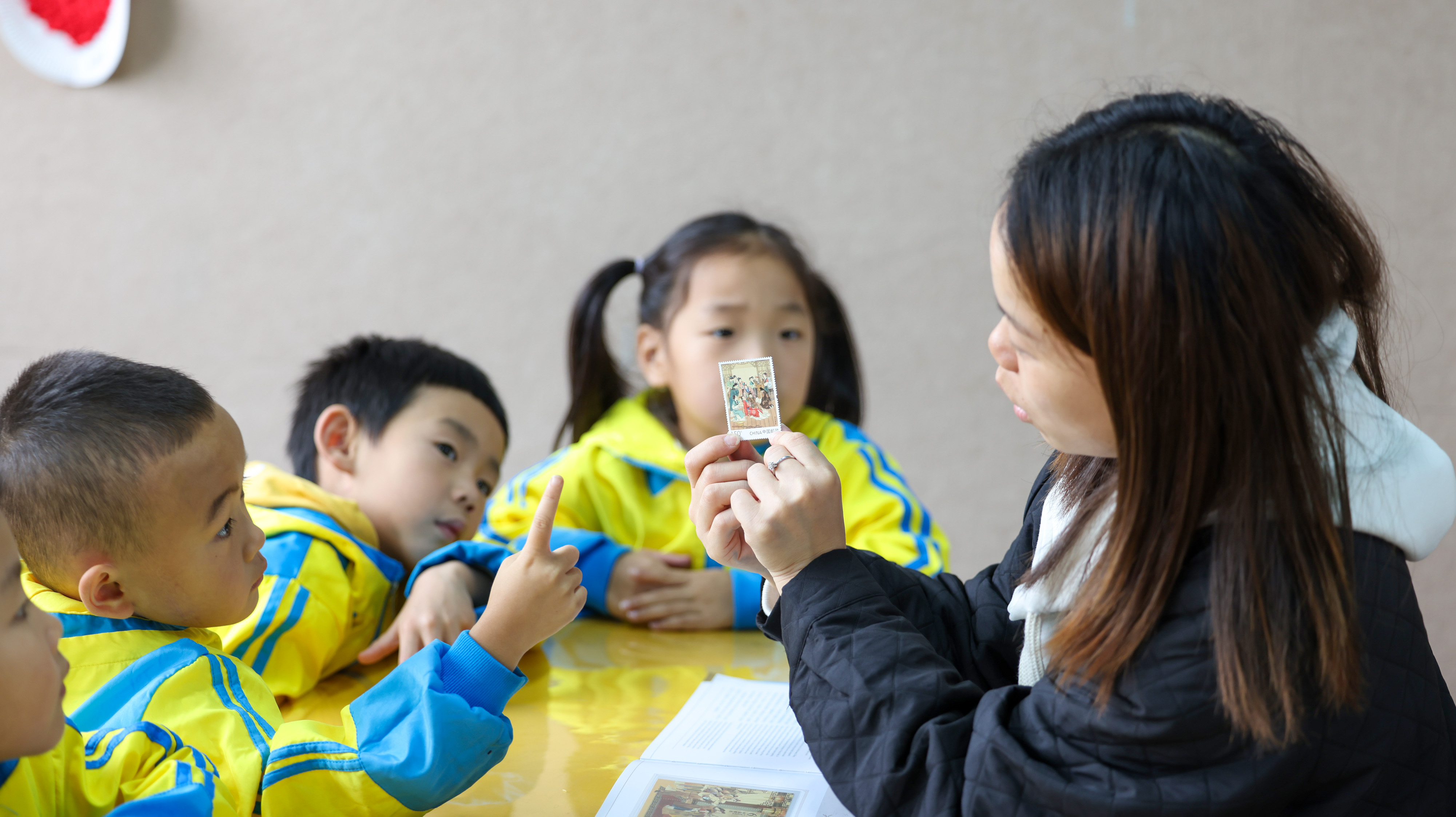 幼儿园的老师给小朋友讲解邮票知识。通讯员 胡攀学 摄