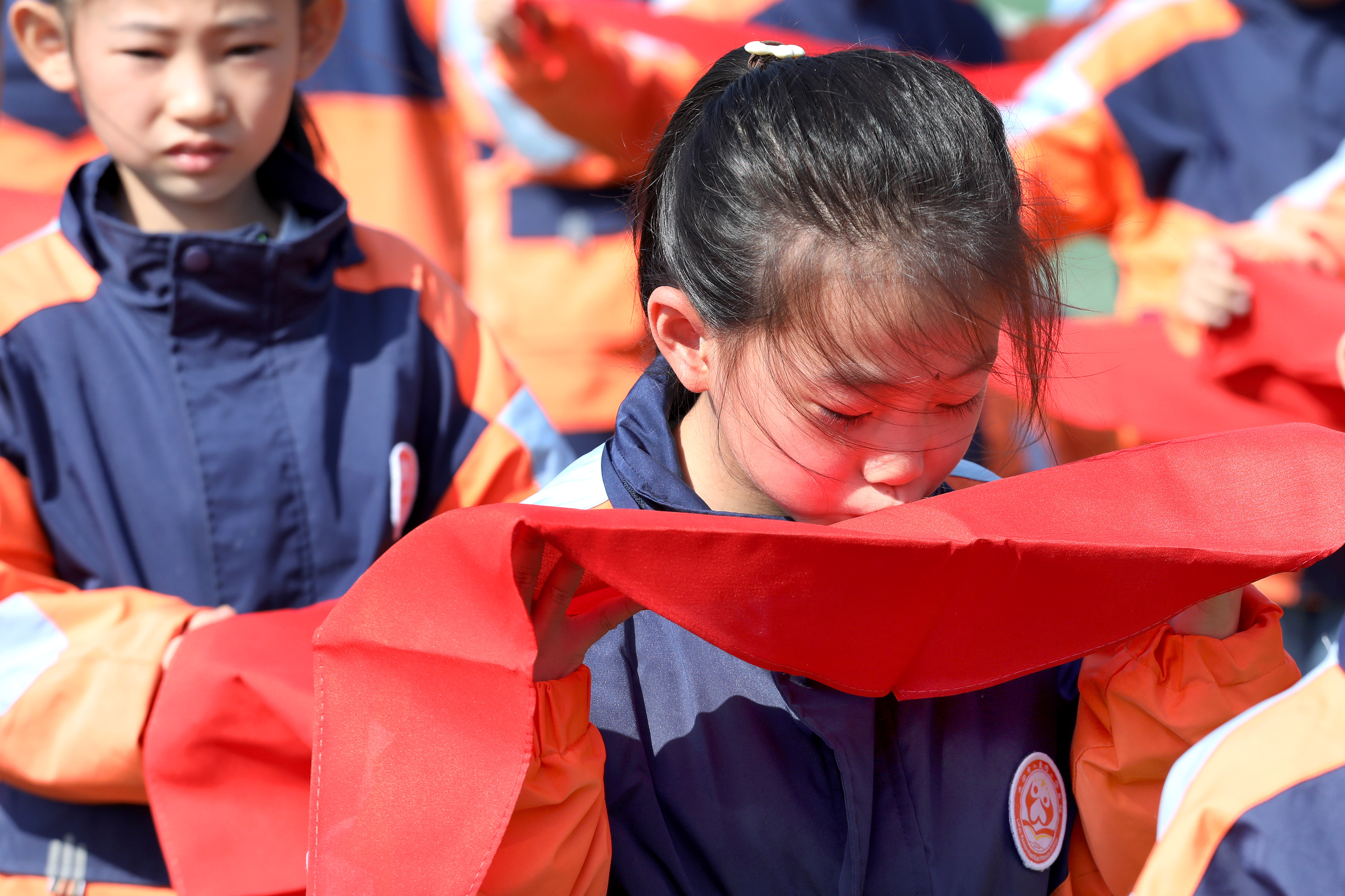 在庆祝中国少年先锋队建队73周年主题队日活动上,一名新队员激动地亲吻着新领取到的鲜红的红领巾。 通讯员 田凯平 摄