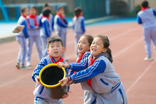 学生们在进行“小投手”趣味游戏。通讯员 王正 摄