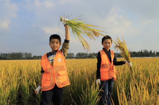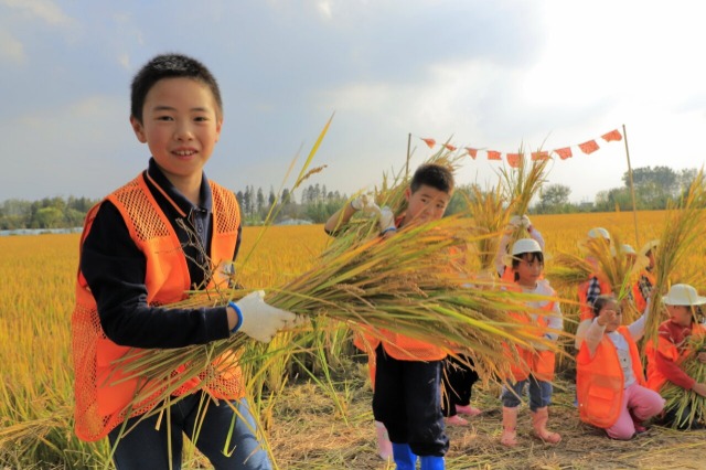 10月22日,江苏省东台市甘港村搭建田间课堂,开展稻文化研学实践活动,来自城市的少年儿童化身小农人收割稻谷、制作米浆饭团、扎稻草人,在田野上体验农耕乐趣,让孩子们在劳动中收获成长,享受丰收的喜悦。通讯员 练益华 摄