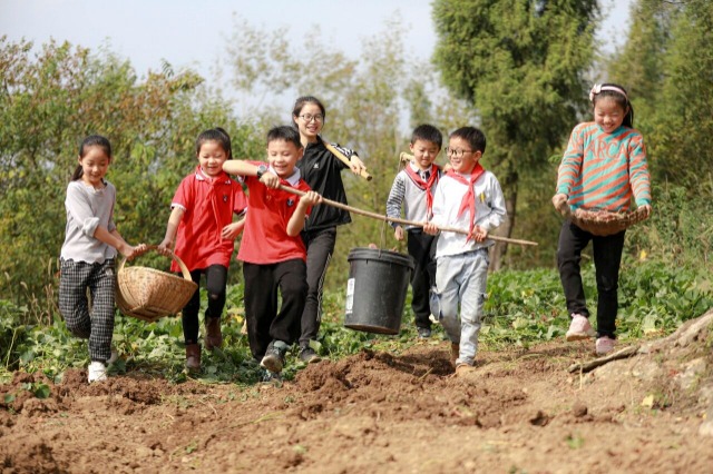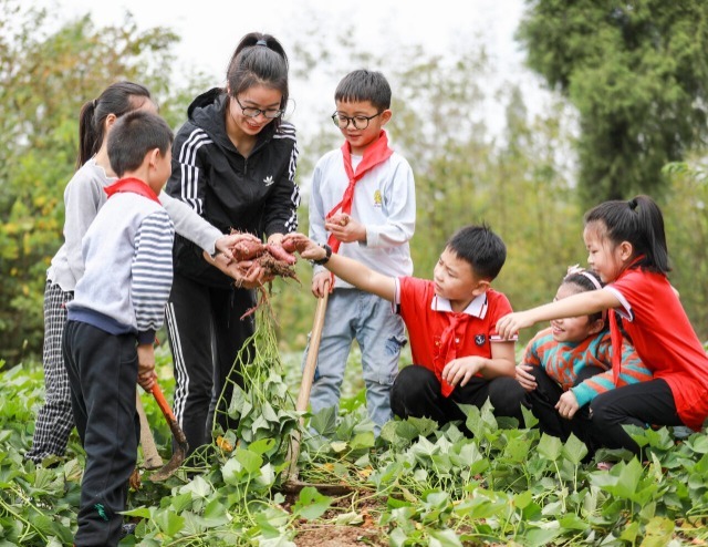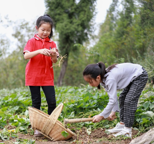 10月23日,在贵州省黔西市甘棠镇同心村的红薯地,村妇联主任带领孩子们挖、挑选、搬运红薯。今年以来的每个周末,贵州省黔西市甘棠镇妇联和纪委联合该镇14个村和社区开展“村社课堂 体验农耕”活动,由妇联干部和劳动模范组织孩子们走进田间地头,体验采收南瓜、掰玉米、挖红薯等,愉快度周末。通讯员 周训超 摄