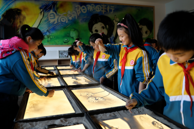 孩子们正在创作沙画。通讯员 陈旗海 摄