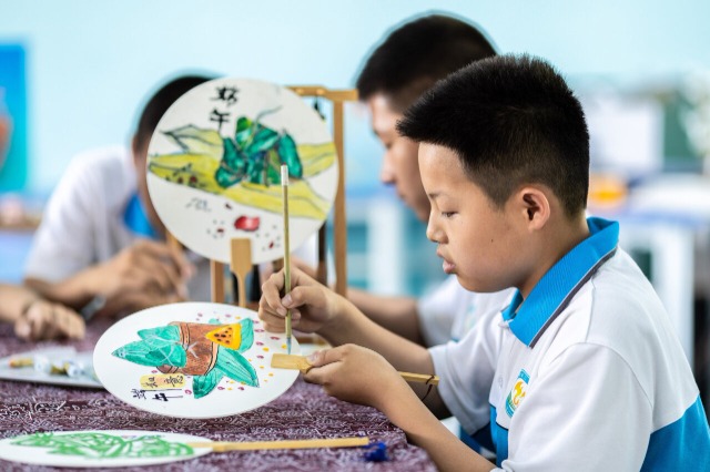 学生在绘制端午彩扇。通讯员 丁根厚 摄