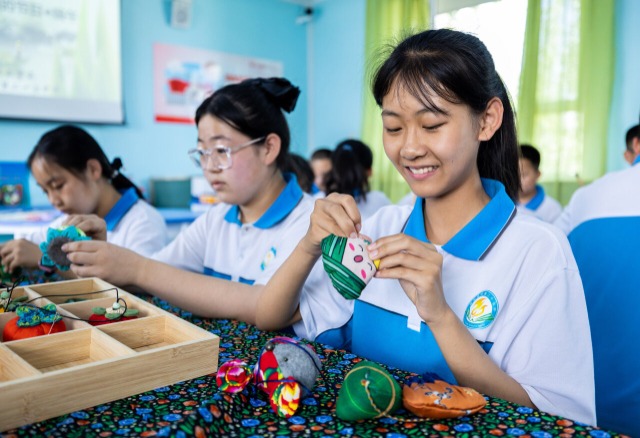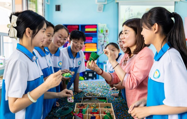 6月19日,内蒙古呼和浩特市第二十七中学开展包粽子、画彩扇、制作香囊、编制五彩绳等丰富多彩的端午民俗活动,让学生了解端午节来历和习俗,感受中华优秀传统文化魅力。中国教育报-中国教育新闻网通讯员 丁根厚 摄