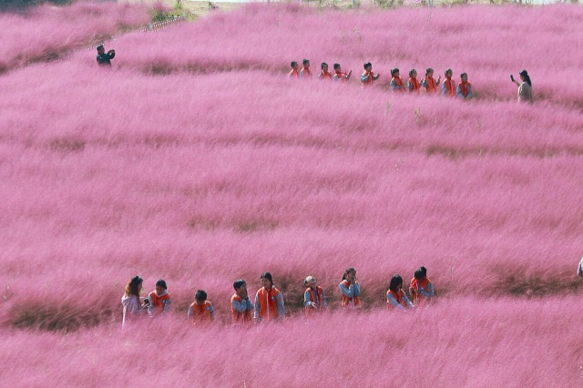 10月11日,山东省高密市王吴小学的孩子们在粉黛乱子草花田里游玩。通讯员 李海涛 摄