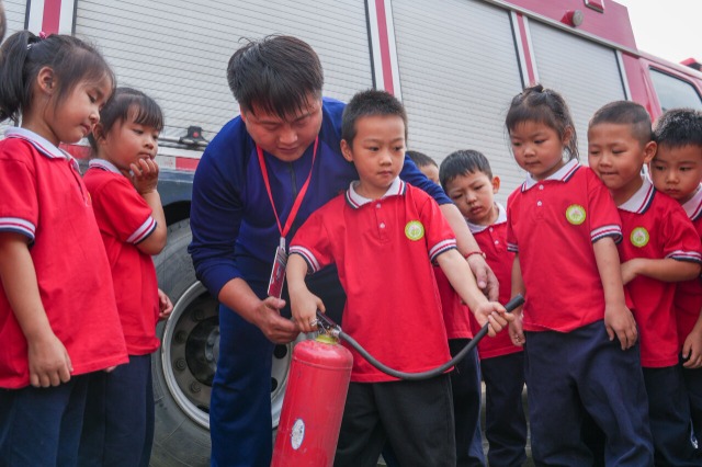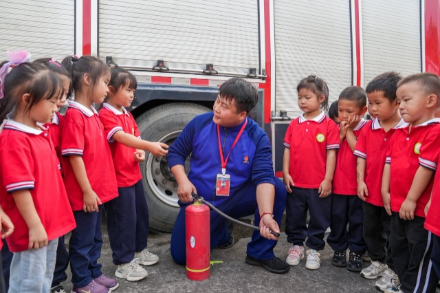 10月11日,浙江省湖州市长兴县李家巷镇计家浜幼儿园内,小朋友们在消防员讲解下了解消防器材的用途。通讯员 钱昕彤 摄