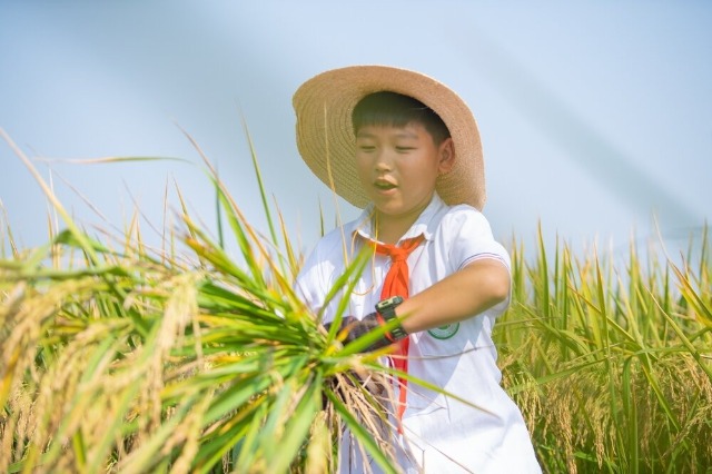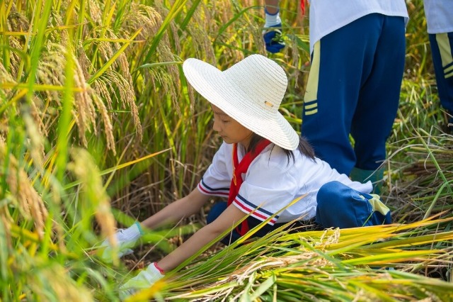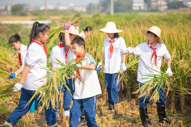 10月15日,安徽省芜湖市繁昌区繁阳镇城关一小,教师组织学生去校外劳动基地开展水稻收割劳动实践活动。活动的开展让学生们感受到丰收的喜悦,同时也体会到粮食的来之不易。该校始终坚持以劳动教育为育人路径,通过校内和校外劳动基地的实践活动开展,让劳动教育走深走实。(中国教育报-中国教育新闻网 通讯员 田园园 摄)