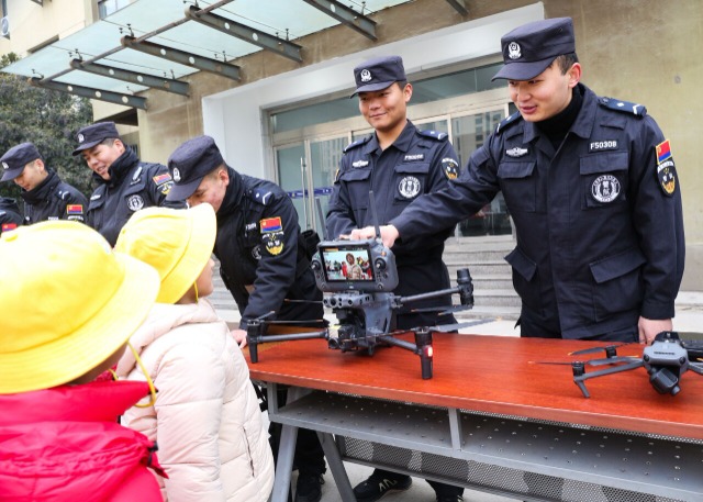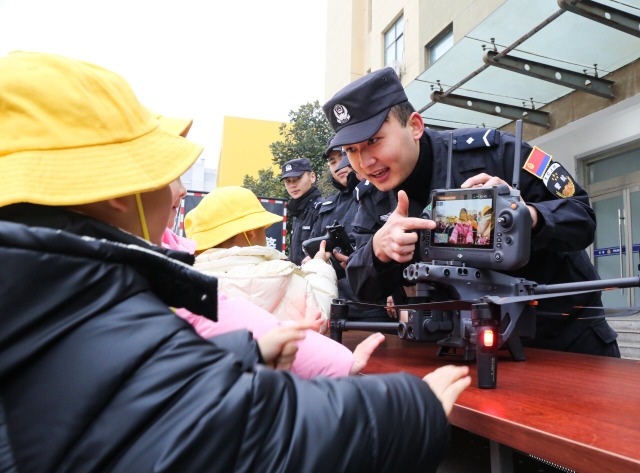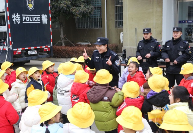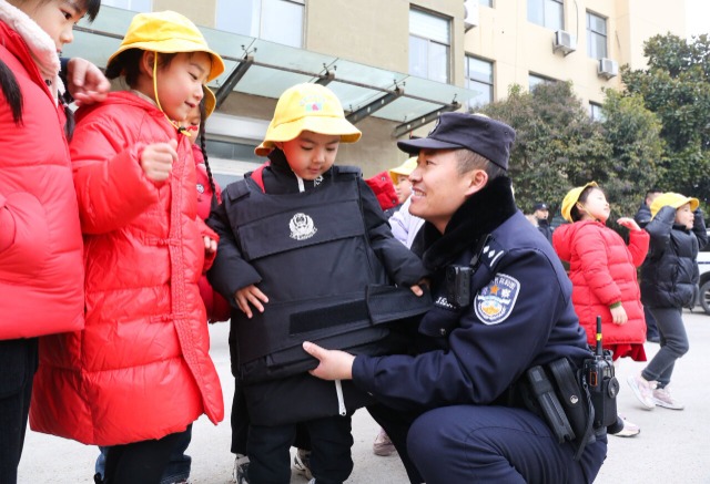 2024年1月9日,在第四个中国人民警察节来临之际,山东省临沂市郯城县公安局举行警营开放日活动,邀请驻地幼儿园师生走进警营,零距离感受警营生活。当日,小朋友们近距离观看、试用现场展示的各种警用装备,切身感受警察文化、体验警察生活,为孩子们的健康快乐成长注入了源源不断的正能量。(中国教育报-中国教育新闻网 通讯员 李结义 摄)