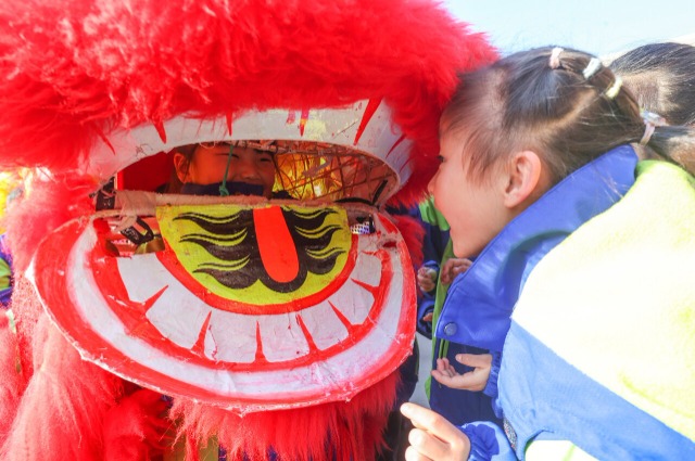 孩子们体验舞狮表演。通讯员 王树成 摄