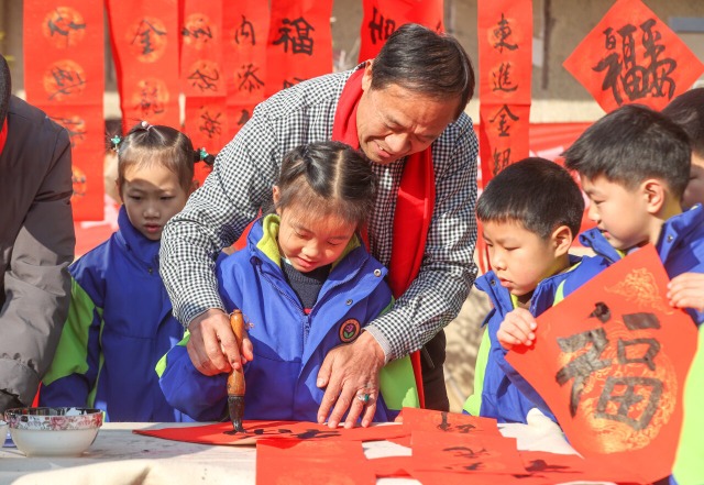 孩子在书法老师的指导下写“福”字。通讯员 王树成 摄