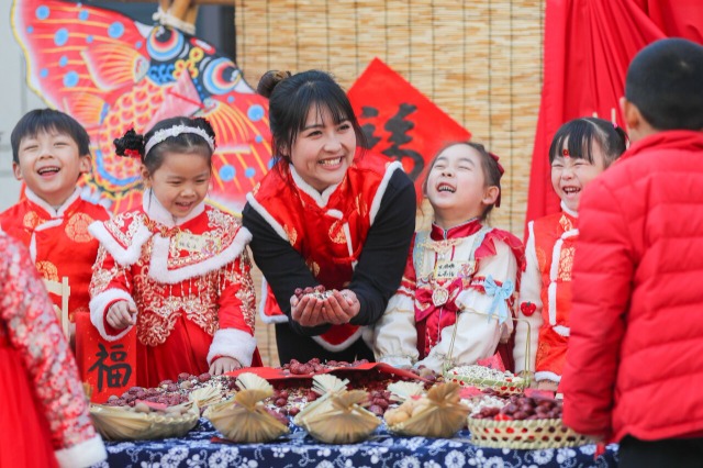 浙江省湖州市德清县武康街道千秋幼儿园开展“萌娃学民俗 开心迎腊八”活动,小朋友通过认食材、做腊八粥、印福字等民俗活动,感受中国传统文化的独特魅力,传承中华民族传统文化,迎接腊八的到来。中国教育报-中国教育新闻网通讯员 王正 摄