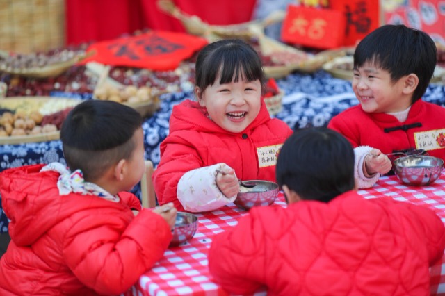 小朋友在品尝腊八粥。通讯员 王正 摄