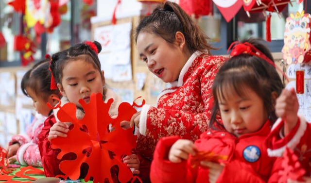 1月16日,贵州省铜仁市玉屏侗族自治县实验幼儿园开展“剪纸迎新春”主题活动。小朋友们在老师的指导下,学习制作迎接新春主题剪纸作品,感受传统年俗文化,迎接龙年新春佳节的到来。中国教育报-中国教育新闻网通讯员 胡攀学 摄